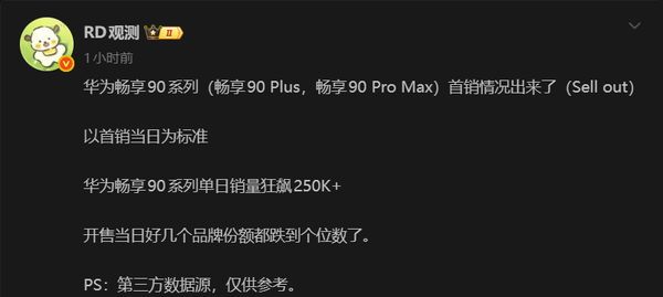 [CNMO科技音讯]4月5日,数码博主@RD不雅测爆料称,华为畅享90系列(畅享90Plus,畅享90ProMax)销量进展强势。爆料表露,该系列手机以首销当日为状态,单日销量冲破25万台。开售当日,多个品牌市集份额受到影响。