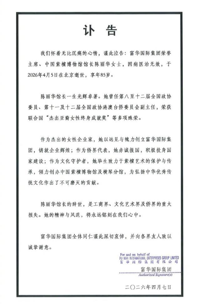 富华国外集团一则讣告,宣告了一个生意与文化据说的拒绝。4月7日,集团阐明其荣誉主席、中国紫檀博物馆馆长陈丽华女士,因病于4月5日在北京衰一火,享年85岁。其子、集团总裁赵勇已全面接纳企业事务,而公众的记念与磋商,则赶快越过了生意领域,投向这位据说女企业家空手起家的欣慰史、对紫檀文化的终生督察,以及那段捏续了三十六载、弥远备受瞩规画专有婚配。