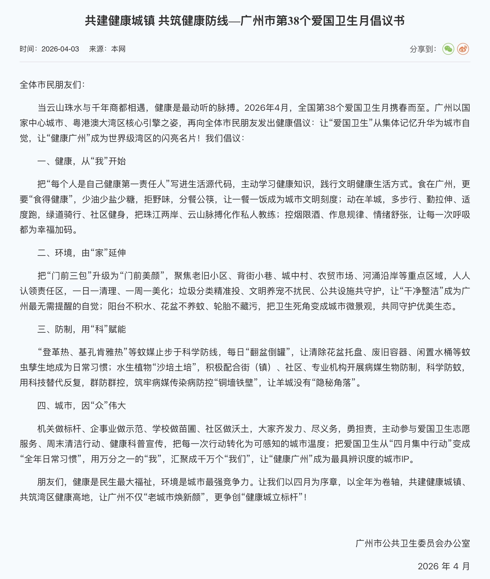4月3日,广州市群众卫生委员会办公室发布《共建健康城镇 共筑健康防地——广州市第38个爱国卫生月倡议书》,面向整体市民发出健康倡议,号召巨匠积极参与爱国卫生开放,践行好意思丽健康生活形式,共同修复整洁优好意思、健康宜居的城市环境。