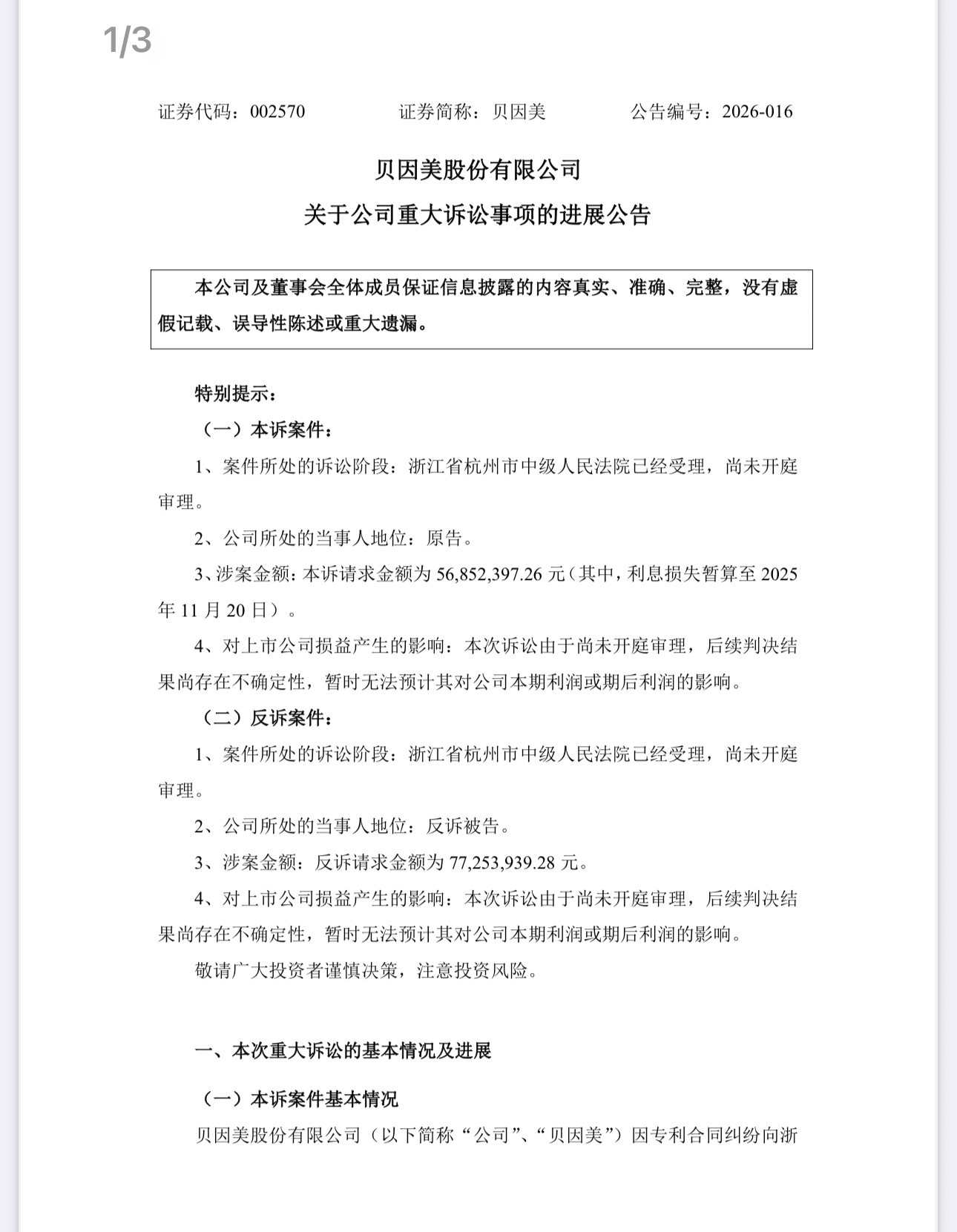 事情得从2月24日晚提及,贝因好意思发了份公告,说我方跟互助方黑龙江丰佑的专利纠纷有了新发达。原来是贝因好意思告状对方,条目归赵5000万定金加利息,系数5685万元。没思到对方平直反诉,反过来索赔7725万元。这一来一趟,两边扯皮的金额加起来当先了1.3个亿。
