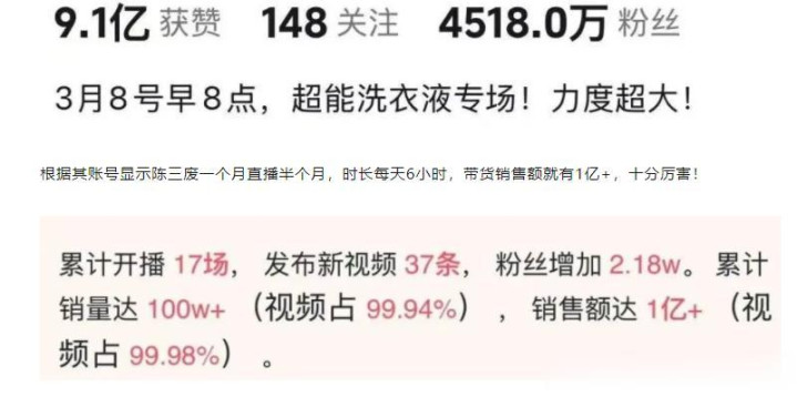 早期的陈三废一家,通过拍摄带有剧厚谊的家庭短视频逐渐积贮东说念主气,视频内容多围绕夫妻糊口、姐弟互动以及家庭日常张开,诚然不少情节被网友以为带有较着“脚本感”,但浅近夸张的抒发阵势反而迷惑了多数不雅众,跟着粉丝规模不断扩大,他也趁势转向直播带货赛说念,在某音平台上逐渐酿成了巩固的交易模式,如今其账号粉丝已越过四千万,直播间的日用百货销量更是屡革命高。