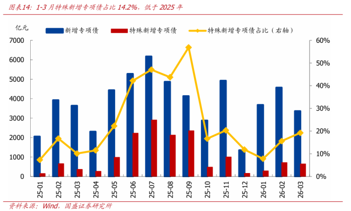 从1-2月数据来看,财政对基建的缓助是“真落地”,而非纸面发力。如前所述,一般财政支拨光显提速、支拨程度也快于季节性,其中基建连接支拨增速同比也由负转正至2.1%、此前衔接8个月同比负增,指向财政并非仅仅在预算口径上“积极”,而是在现款流和神情支付层面也曾光显前置。值得留神的是新增专项债中,用于化解存量债务的占相比低、1-3月非凡新增专项债占比仅14.2%,这与2025年部分期间“化债分流新增投资资金”的情形不同,2026年开年的新增资金对新神情建设的拉动更强。