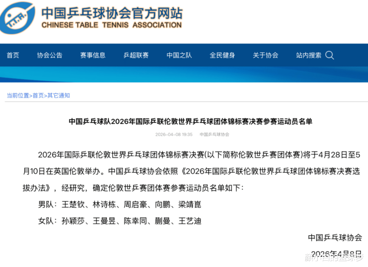 北京技巧4月8日,把柄中国乒乓球协会官方网站,2026年伦敦世乒赛团体赛的负责名单出炉。