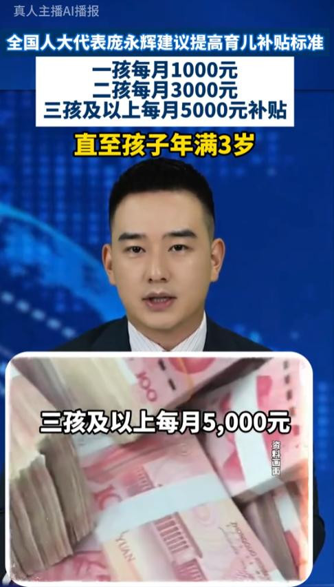 宇宙东说念主大代表庞永辉提议,一孩每月补贴1000元,二孩每月3000元,星空体育三孩及以上每月5000元,一直补贴到孩子3岁。